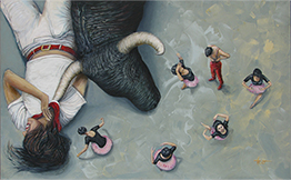The contrast of the powerful bull and the delicate dancers evokes a powerful story of resilience and vulnerability. This painting encourages contemplation on how strength and fragility coexist, sparking a deeper appreciation for the beauty found in life’s most intense moments.