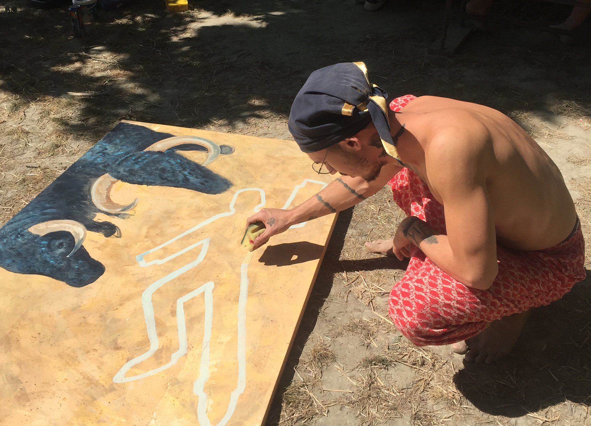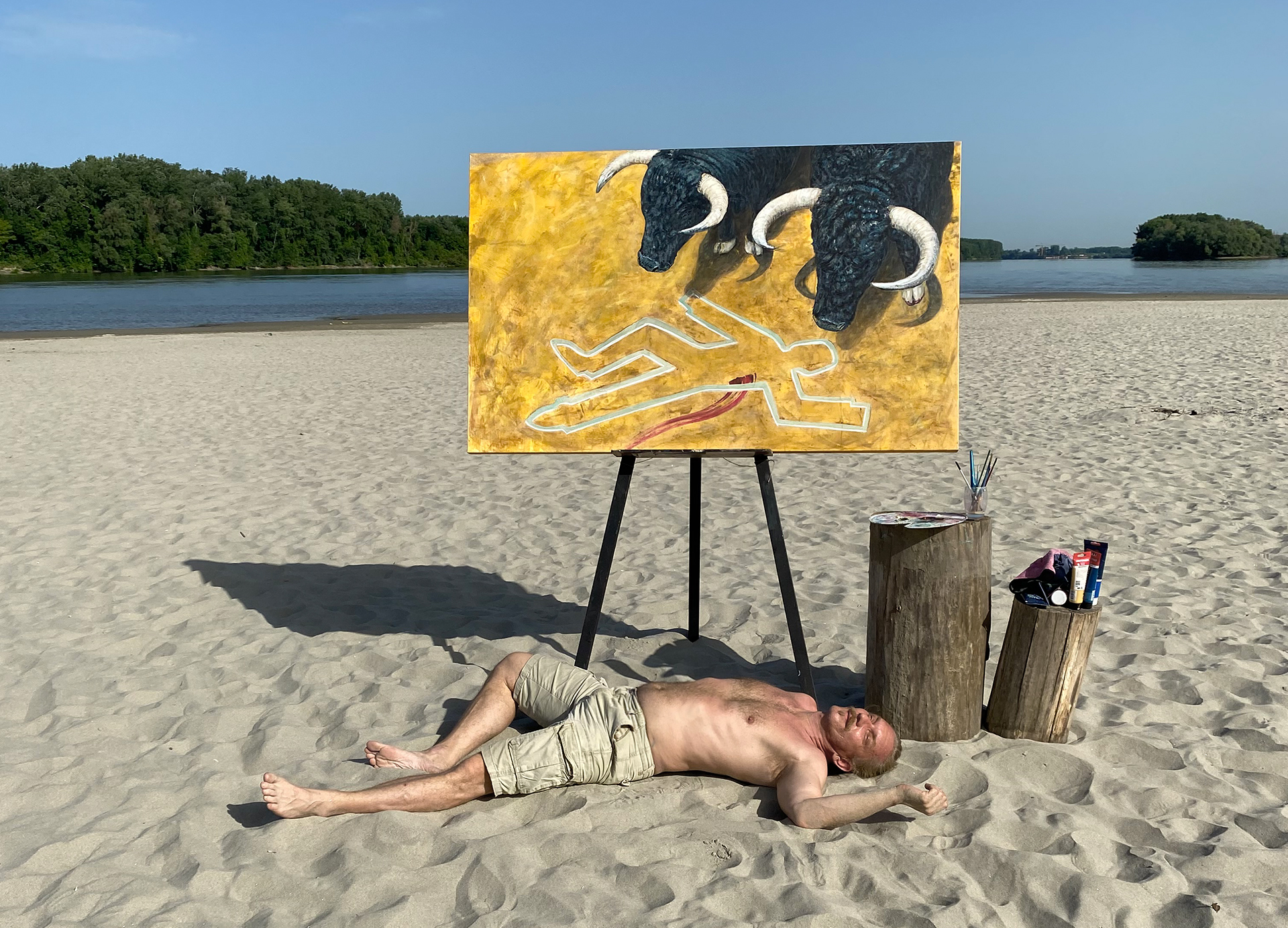 The painting utilizes acrylic on canvas, employing a raw, minimalist technique to create a profound impact. The use of a yellowish, textured ground, reminiscent of a bullring’s sand, contrasts sharply with the sleek black and white of the bulls in this provocative artwork, drawing the viewer’s eye to the central figures and the poignant chalk outline.