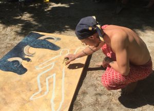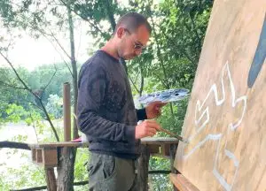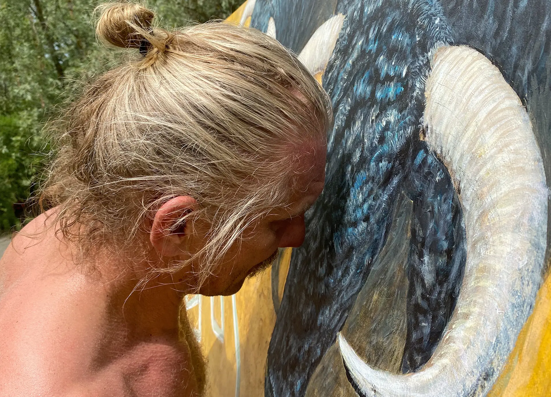 “Crime Scene” delves into the broader anti-war message and the story of Civilón. Civilón, destined for the bullfighting ring alongside his two brothers, was spared due to an injury while his brothers were sent to their deaths in Valencia. This bull painting captures the imagined victory of those bulls, their dreams of defeating the aggressor, and leaving him lifeless on the ground.